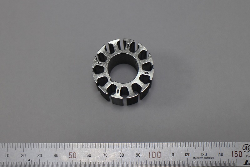 こちらは、アウターステータコアの試作品です。材質は50A1000で、FA、ロボット、動力伝動装置に使……